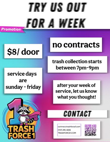 At Trash Force 1, trash valet has never been easier. We take pride in putting our customers first! Whether you prefer to talk, text, email, or meet in person, we will make it happen every time. We also encourage our clients to contact us for email updates on how we can help you recycle and upcycle, ensuring we all share the responsibility of waste management.