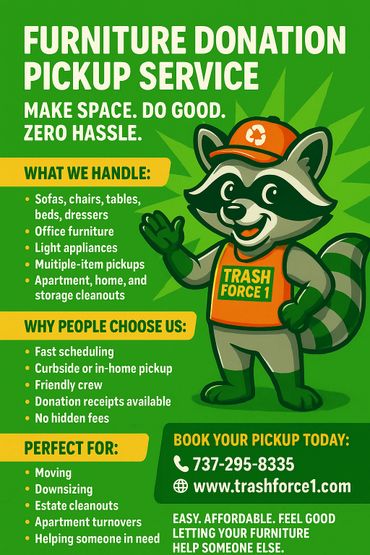 No 800 numbers, no corporate hassles! Trash Force 1 is locally owned and operated in Austin, Texas. When you contact us through our local number, you'll get the same person every time. Another great thing about being locally owned and operated is that Corinne collaborates with local non-profits to upcycle many items that a typical junk-ha